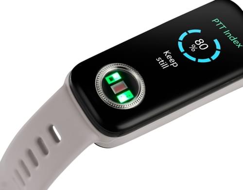 - 採用 0.96 吋 OLED 螢幕,螢幕下有金屬圈用來量測脈波指數 (血壓&心率&血氧參考值)